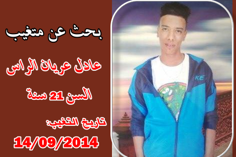 تنهي عائلة عريان الراس بمدينة جرسيف الى عموم المواطنين مساعدتها في العثور على إبنها عادل الذي يبلغ من السن 21 سنة،والذي خرج من المنزل بتاريخ 2014/09/14 متجها نحو مدينة السعيدية للبحث عن عمل.